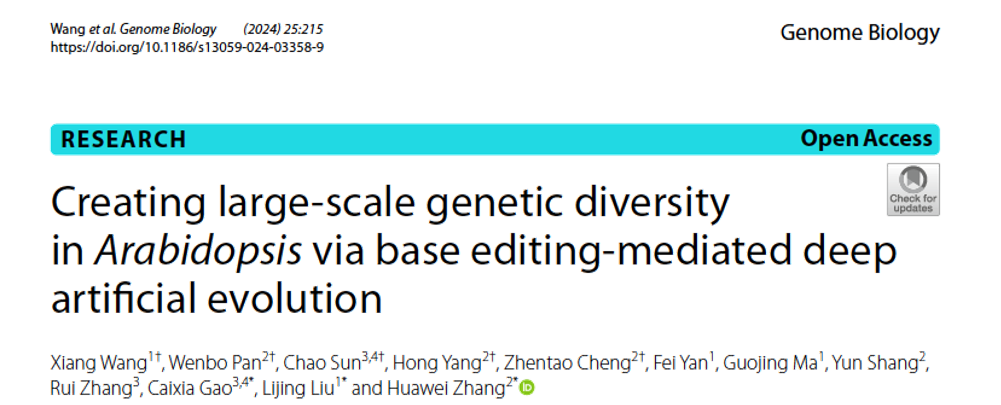 8月9日,刘利静团队与北大现代农业研究院张华伟团队及中科院遗传与发育所高彩霞团队合作在Genome Biology上联合发表了题为“Creating large‑scale genetic diversity in Arabidopsis via base editing‑mediated deep artificial evolution”的研究论文。该论文利用拟南芥生长周期短、种子量大、筛选容易等特点结合传代倍增突变体株系技术,开发了一种新的植物内源基因高通量深度定向进化方法。