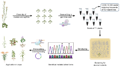 基因的多样性是作物遗传育种的基础,随着全球人口的增加和对食物需求的增大,天然的突变形式已难以满足现代遗传育种的需求。近几年,随着基因编辑技术的发展,利用碱基编辑器进行的基因定向进化逐渐进入科学家的视野。相比于传统方法,定向进化可以更快地创造出生产需要的优势等位基因。但现有的人工定向进化技术一次可产生的突变体有限,导致单个基因编辑位点的进化潜能被严重低估。以胞嘧啶碱基编辑器(CBE)为例,该系统不仅可以造成C-to-T,还能够以较低的效率造成C-to-G和C-to-A的碱基替换。因此,当编辑窗口内存在多个C时,理论上可能存在数千乃至上万种潜在的突变形式。其中多数突变形式为低频突变,筛选出这些低频突变可能需要建立数十万甚至百万株系量级的突变体库。而现有的依赖于组培再生技术的植物基因人工定向进化系统难以获得如此大的突变体库。