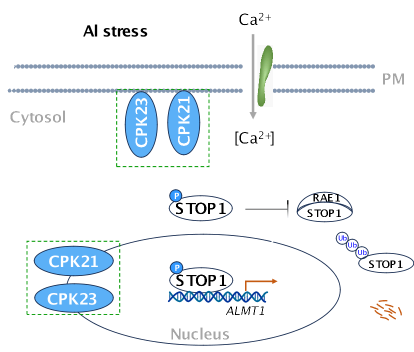 Al-Ca2+-CPK21/23-STOP1信号级联参与ALMT1依赖性铝抗性的模式图