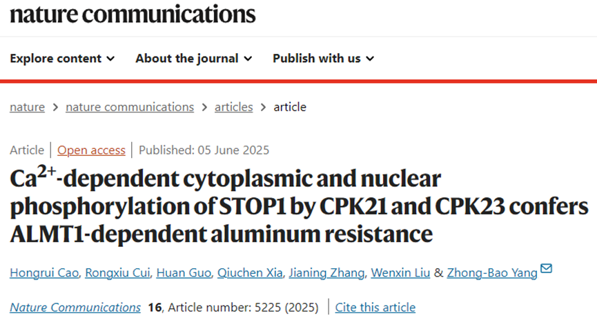 6月5日,山东大学生命科学学院/植物发育与环境适应教育部重点实验室/山东省作物精准分子设计育种重点实验室杨中宝教授课题组在Nature Communications发表了题为“Ca2+-dependent cytoplasmic and nuclear phosphorylation of STOP1 by CPK21 and CPK23 confers ALMT1-dependent aluminum resistance”的研究论文,系统揭示了CPK21和CPK23通过磷酸化稳定转录因子STOP1从而激活ALMT1介导的苹果酸外排,赋予植物铝抗性的分子新机制。