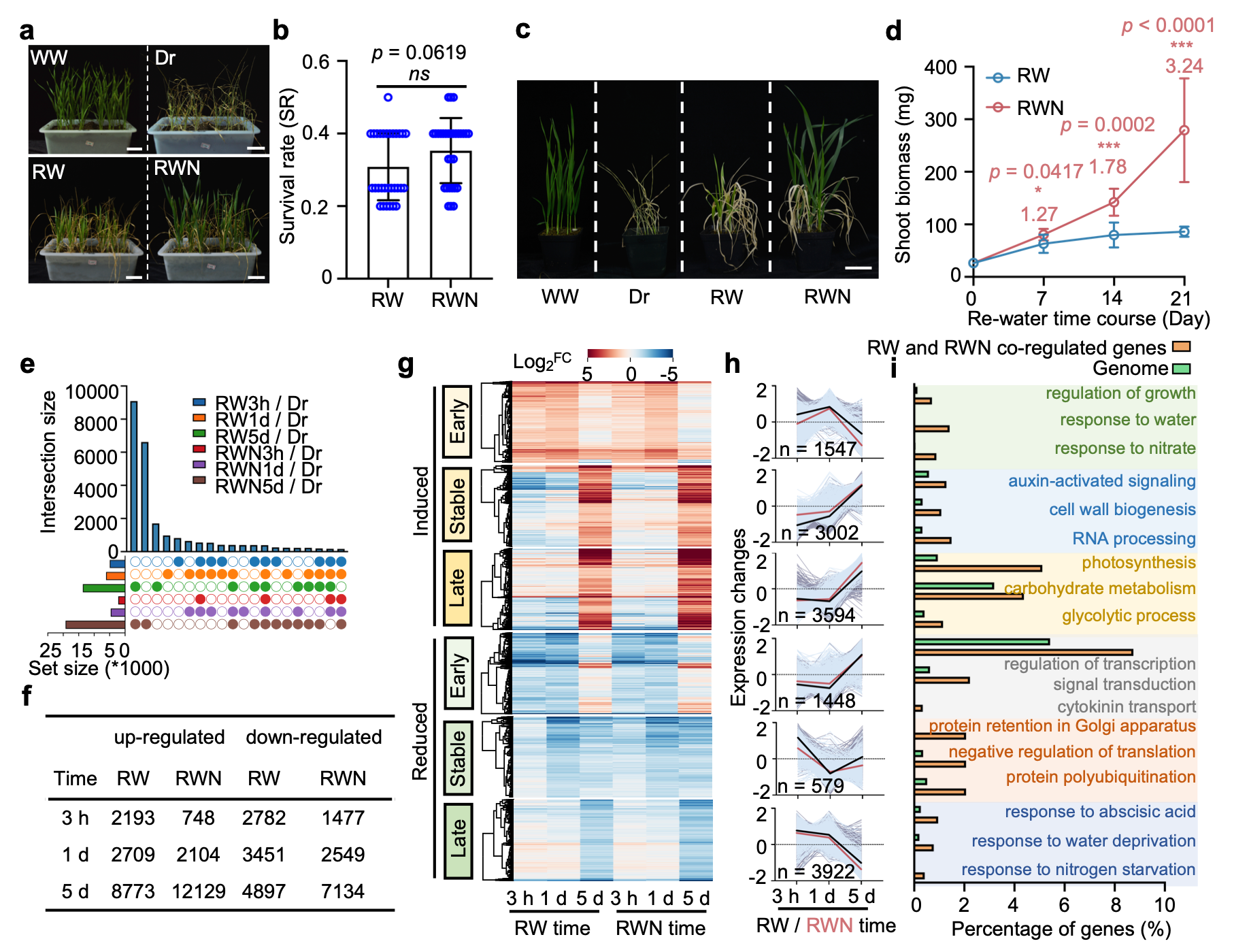 (a,b)硝酸盐对存活率的影响(c,d)硝酸盐促进小麦干旱后恢复(e-i)硝酸盐增强了复水对基因表达的促进作用