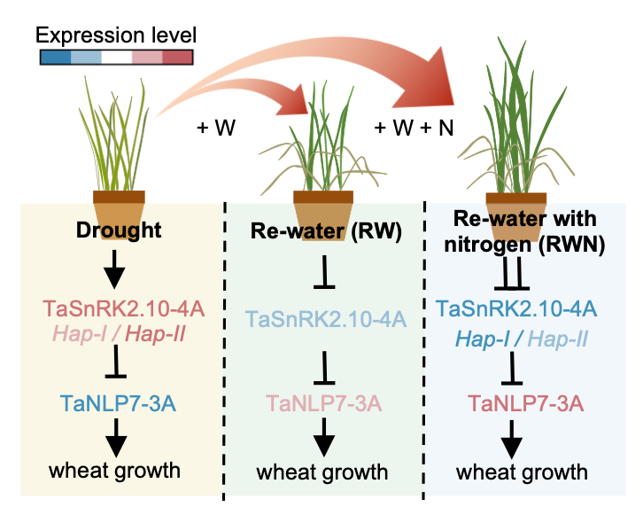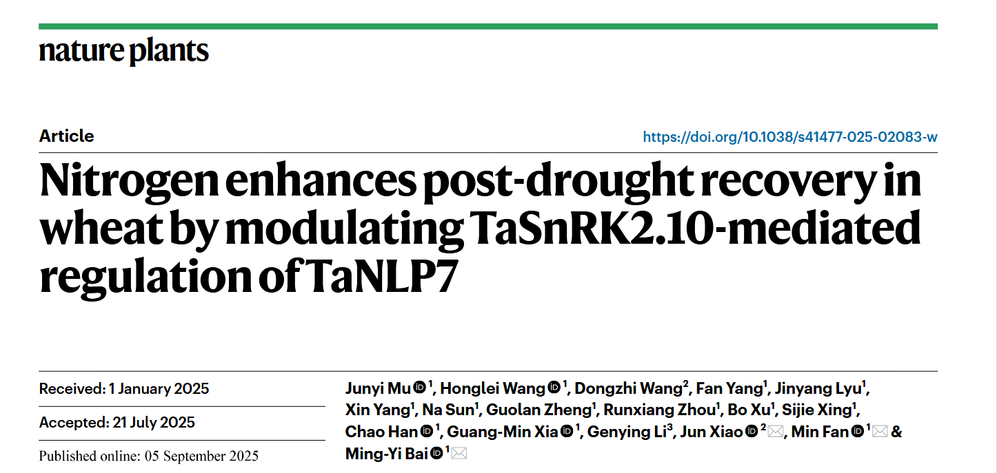 9月5日,山东大学生命科学学院白明义/樊敏教授团队联合中科院遗传与发育生物学研究所肖军研究员团队在国际权威学术期刊Nature Plants上在线发表题为“Nitrogen Enhances Post-Drought Recovery in Wheat by Modulating TaSnRK2.10-Mediated Regulation of TaNLP7”的最新研究成果。首次揭示硝酸盐通过解除脱落酸(ABA)信号核心激酶TaSnRK2.10-4A对硝酸盐信号关键转录因子TaNLP7-3A的抑制,驱动小麦干旱胁迫后快速恢复的分子机制。该研究建立了水氮协同调控植物生长发育的新体系,揭示了水氮耦合促进小麦生长的新机制,为农业水肥一体化管理提供了重要理论依据和技术支撑。