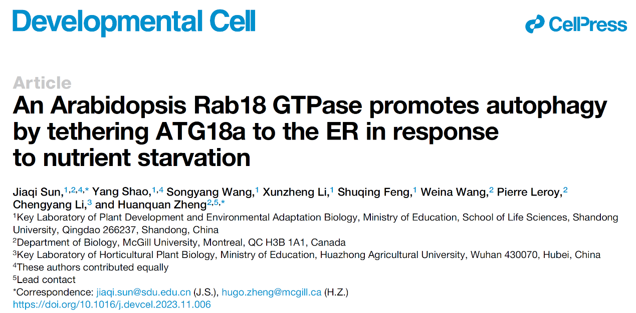 近日,山东大学孙佳琦团队与加拿大麦吉尔大学郑环泉团队合作,于Developmental Cell在线发表了题为 An Arabidopsis Rab18 GTPase promotes autophagy by tethering ATG18a to the ER in responseto nutrient starvation 的研究论文,揭示了RABC1蛋白在营养匮乏条件下能够促进ATG18a蛋白在内质网上的锚定,从而加速自噬体的扩张,这为我们理解植物如何调整其内部结构以适应外部环境变化提供了全新的视角。