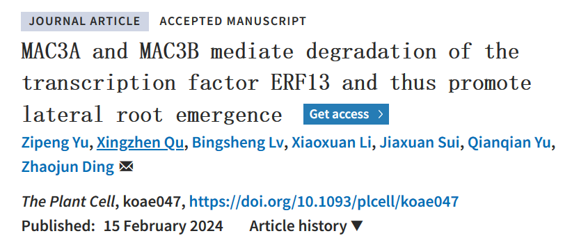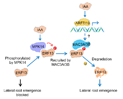 山东大学生命科学学院丁兆军团队先前阐明了MPK14激酶在生长素诱导侧根发生中的关键角色(Mol Plant, 2021):MPK14通过磷酸化降解ERF13(侧根发育关键抑制子),从而促进侧根发生。但磷酸化“先行信号”如何驱动ERF13降解依然未知。近日,该团队成功解决了这个问题,并在The Plant Cell发表了题为“MAC3A and MAC3B mediate degradation of the transcription factor ERF13 and thus promote lateral root emergence”的研究论文,揭示了生长素通过同步激活MPK14激酶和MAC3A/3B泛素连接酶协同清除ERF13,从而驱动侧根发生的分子机制。