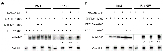 进一步分析发现MAC3A/3B虽然可以泛素化ERF13,但需要满足一定的前提条件:即MPK14介导生长素信号对ERF13的磷酸化修饰。大量生化证据证实MPK14对ERF13的磷酸化修饰是增强ERF13招募MAC3A/3B并导致自身降解的关键信号。