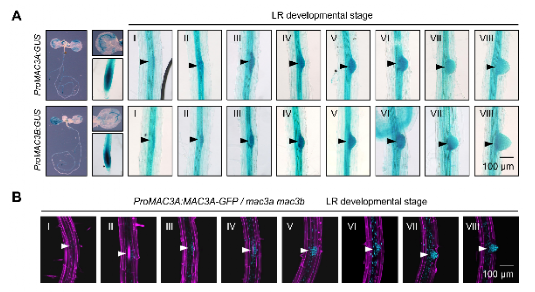 为了揭示ERF13响应生长素的降解机制,作者从鉴定ERF13的互作蛋白入手(IP-MS),成功鉴定到和其互作的E3泛素连接酶MAC3A/3B。结合组织表达模式分析,证实MAC3A/3B在侧根发育的八个时期均有表达,暗示其可能参与侧根发生。