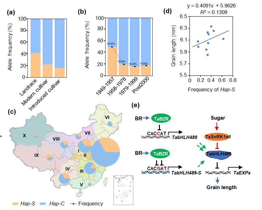 通过构建小麦过表达株系与基因编辑突变体,证实敲除TabHLH489能够显著增加小麦籽粒长度与千粒重,而过量表达TabHLH489能够抑制小麦粒长,导致千粒重降低。研究显示TabHLH489是植物甾醇激素油菜素内酯(BR)的负调控因子,敲除TabHLH489导致小麦对BR的敏感性增强。在BR受体突变体tabri1和BR负调控激酶TaSK2过表达的转基因小麦中,TabHLH489的表达量显著增高,导致小麦籽粒变短,千粒重降低。相反,在TaSK2敲除突变体和BR信号转导关键转录因子TaBZR1过表达的小麦中,TabHLH489的表达量降低,小麦籽粒变长,千粒重增加。此外,研究还发现TaBZR1直接结合TabHLH489启动子,抑制其表达。单倍型分析与DNA-protein结合实验进一步揭示了TaBZR1与TabHLH489启动子之间的相互作用机制。来自中国春的单倍型(Hap-C)和石新828的单倍型(Hap-S)在启动子结合能力上存在差异,这种差异调控了TabHLH489不同单倍型的转录水平,从而导致了不同的小麦粒长和千粒重。