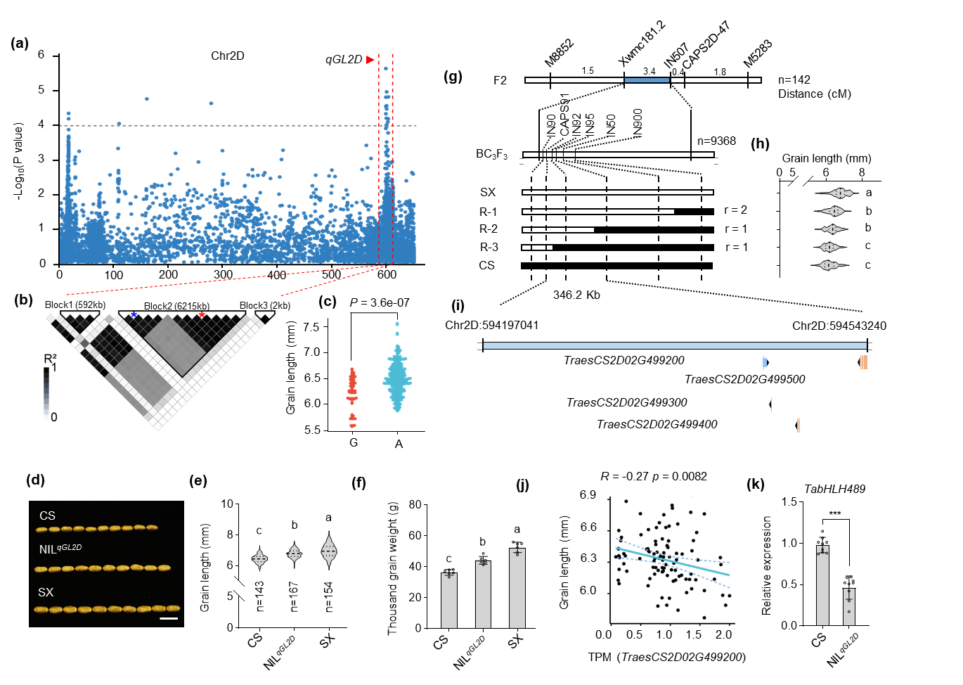 该研究利用包含343个小麦品种和21个地方品种的自然群体进行了全基因组关联分析,成功定位到了小麦2D染色体上调控小麦粒长的关键位点qGL2D。这一位点能够解释群体中15.17%的籽粒长度变异。为了克隆这一区间的关键基因,研究团队利用中国春与石新828构建了包含9368个个体的定位群体BC3F3。精细定位结果显示,候选基因位于标记CAPS91与IN95之间的346.2kb区域内。通过进一步分析102份小麦品种表型数据与花后10天种子的转录组数据,研究团队发现,一个编码非典型bHLH转录因子TabHLH489的表达量与籽粒长度存在显著的负相关,推测其可能直接参与调控小麦粒长。