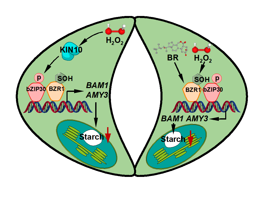 白明义/韩超团队先前的研究工作显示,在正常生长条件下,H2O2在植物表皮细胞气孔拟分生组织细胞和保卫细胞中特异富集,并能通过促进植物能量调节因子SnRK1复合体催化亚基KIN10的细胞核定位来促进气孔发育。为进一步阐明H2O2在保卫细胞中特异富集的生物学意义,团队首先通过试剂处理以及遗传干扰清除保卫细胞中的H2O2。结果显示在清除H2O2后,植物气孔见光后不能正常开放。进一步研究显示kin10的突变体能够抑制过氧化氢酶cat2突变体气孔开度较大的表型,并显著抑制保卫细胞中的淀粉降解。H2O2一方面促进KIN10蛋白在保卫细胞中特异进入细胞核,与转录因子 bZIP30相互作用并使其磷酸化,促进bZIP30与油菜素甾醇信号转导核心转录因子BZR1形成复合体;另一方面,H2O2还诱导BZR1发生氧化修饰,促进BZR1与bZIP30形成复合体,进而诱导α-淀粉酶3(AMY3)和β-淀粉酶1(BAM1)表达,从而促进保卫细胞的淀粉降解和气孔开放。